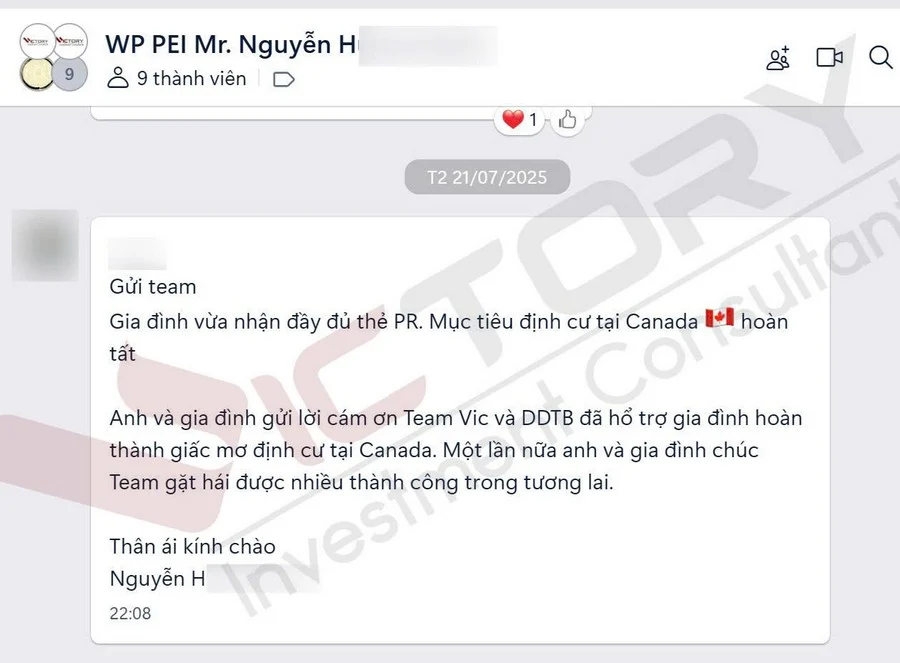 VICTORY xin chúc mừng gia đình anh N.H.K – khách hàng của Victory – đã chính thức nhận được Confirmation of Permanent Residence (CoPR) theo diện Doanh nhân tỉnh bang Prince Edward Island (PEI).