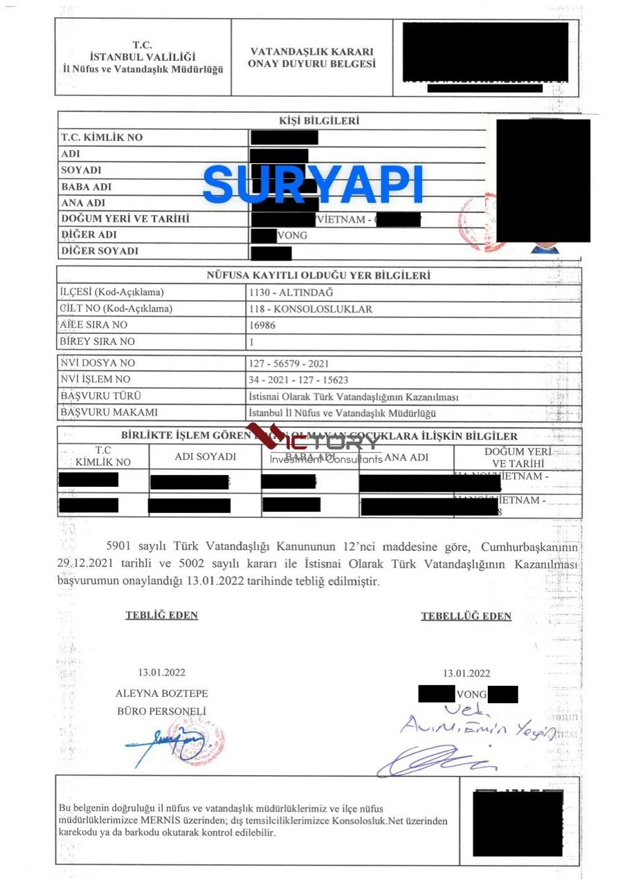 Tôi thực sự bất ngờ về sự đơn giản của thủ tục định cư Thổ Nhĩ Kỳ. Nhờ sự hướng dẫn tận tình của Victory, tôi đã hoàn tất hồ sơ rất nhanh chóng. Tôi không phải lo lắng về bất kỳ thủ tục hành chính nào vì đã có Victory lo hết. Tôi đánh giá cao sự chuyên nghiệp và hiệu quả của Victory.